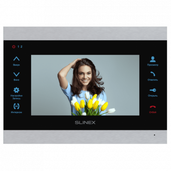 Абонентский монитор Slinex SL-07M silver+black оснащен 7" цветным TFT LCD-дисплеем с разрешением 800×480. Предусмотрено одновременное подключение до двух вызывных панелей, двух камер видеонаблюдения и телевизора. При соединении нескольких (до четырех) видеодомофонов в интерком, SL-07M silver+black выступает в роли дополнительного монитора.