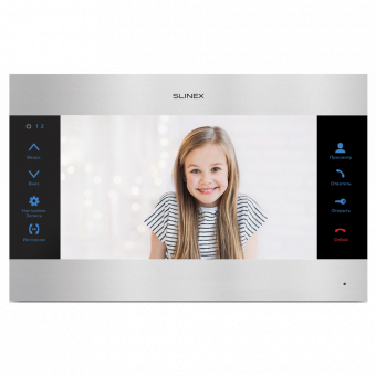 Абонентский монитор Slinex SL-10M silver+black укомплектован цветным TFT LCD-дисплеем с диагональю 10" и разрешением 800×480, рассчитан на подключение до двух аналоговых вызывных панелей, двух аналоговых камер видеонаблюдения, телевизора. Выступает в роли дополнительного монитора при соединении нескольких (до четырех) видеодомофонов в интерком.